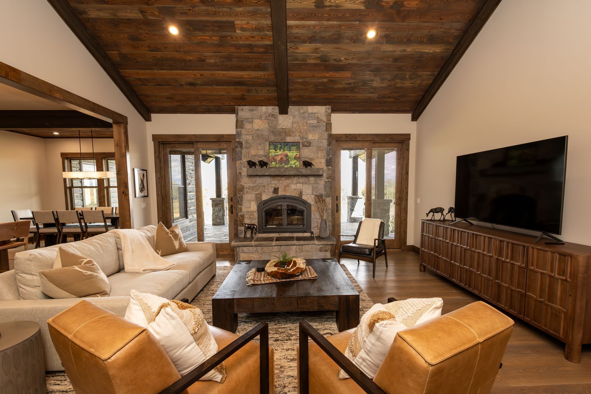 Stay in one of four custom luxury homes, full of amenities like a gourmet kitchen, beautiful hardwood floors and ceilings, indoor and outdoor living spaces, fireplaces, custom-built furniture, and art that reflects the beauty of the surroundings. Each home has been thoughtfully built along the meandering Prairie Creek to give you a front row view of nature.
